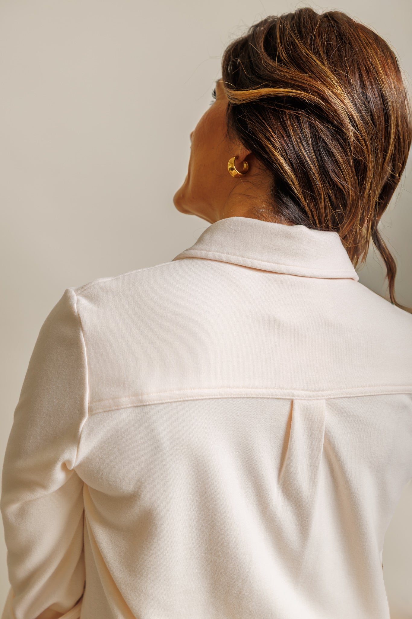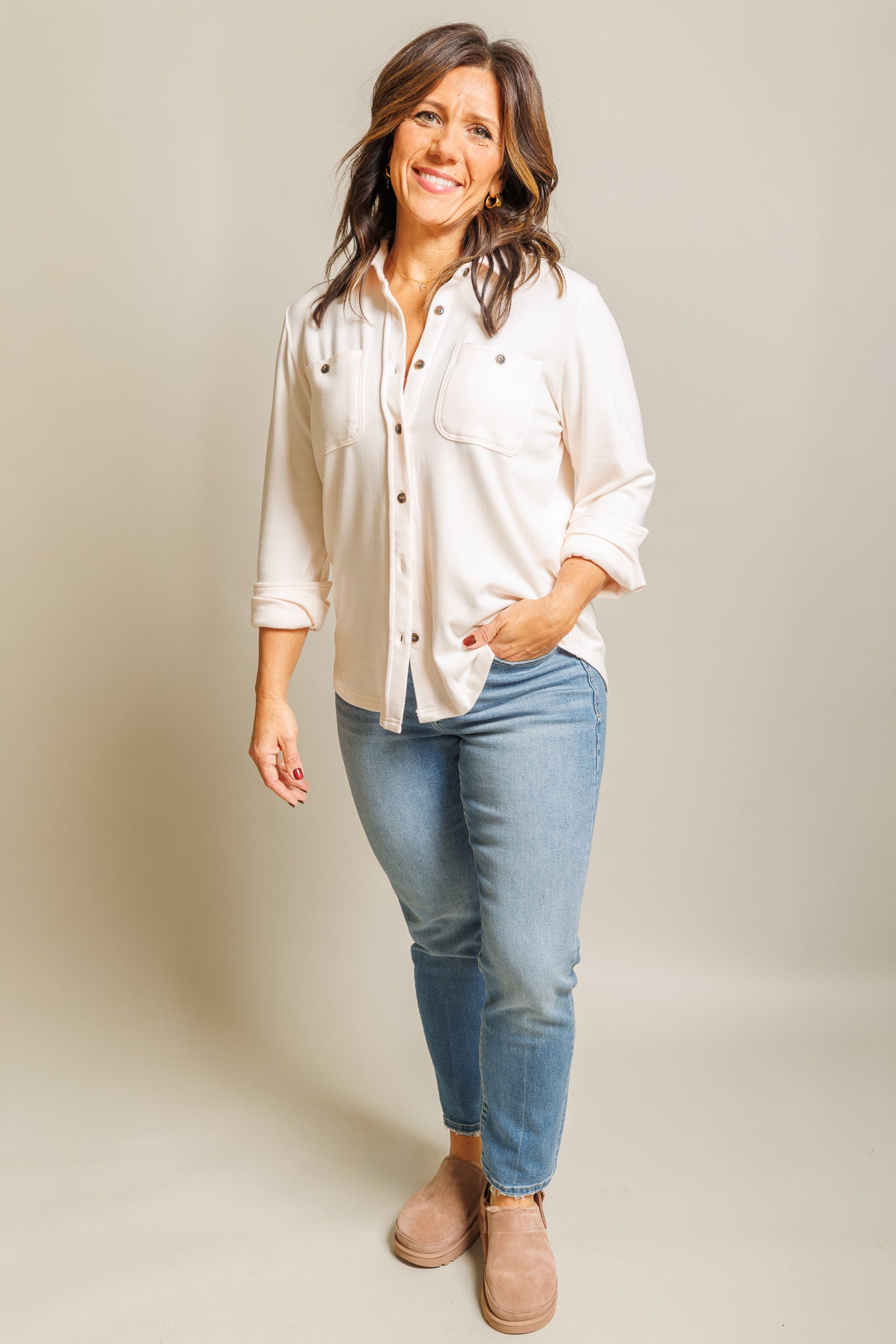 Stay cozy and stylish in the Addie Button Up, crafted from a super soft blend of rayon, acrylic, and spandex for just the right stretch and comfort. Its ivory shade and playful button details on the front pockets add a charming touch to your everyday look. Perfect for layering or wearing solo, this shirt is as versatile as it is fun!