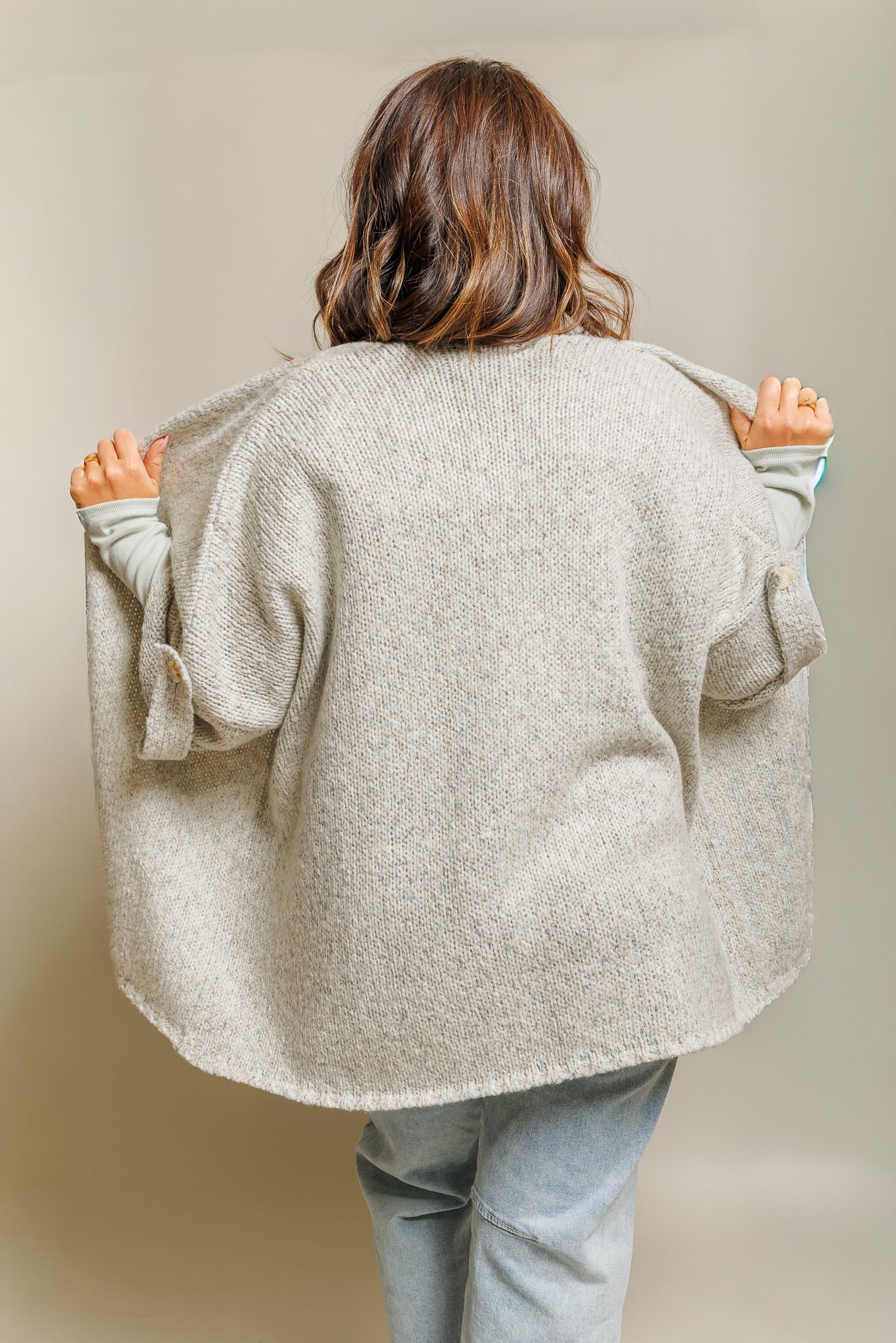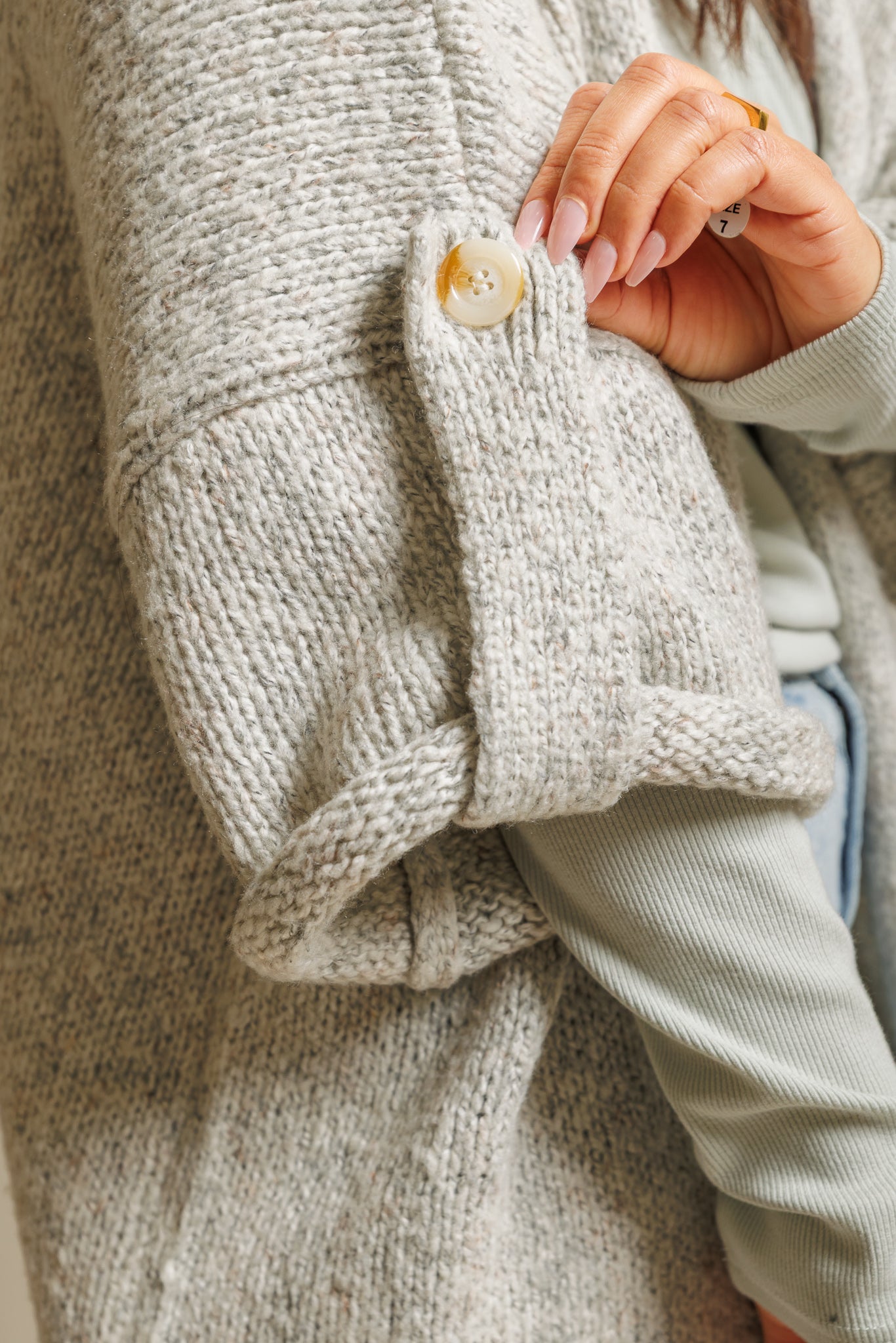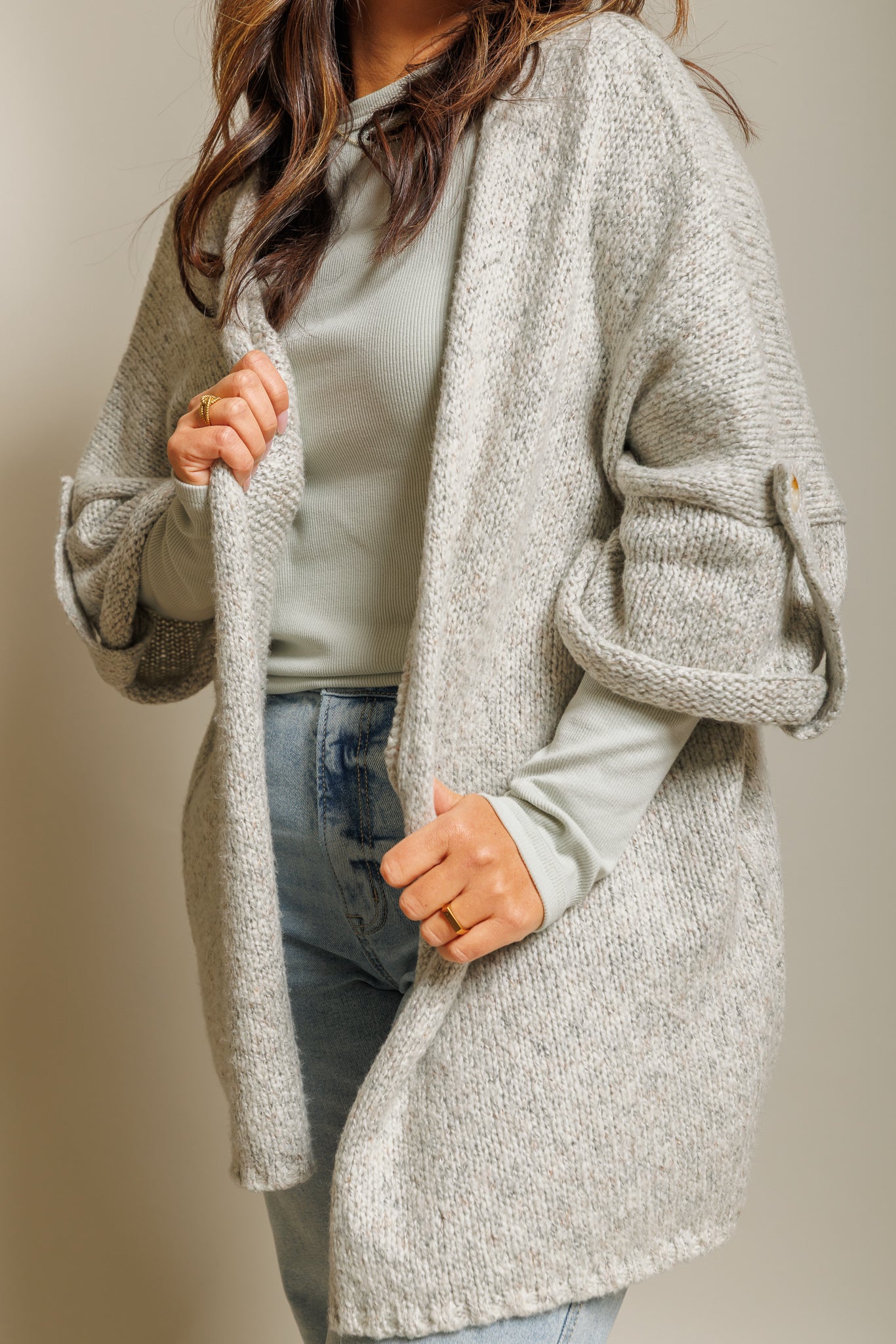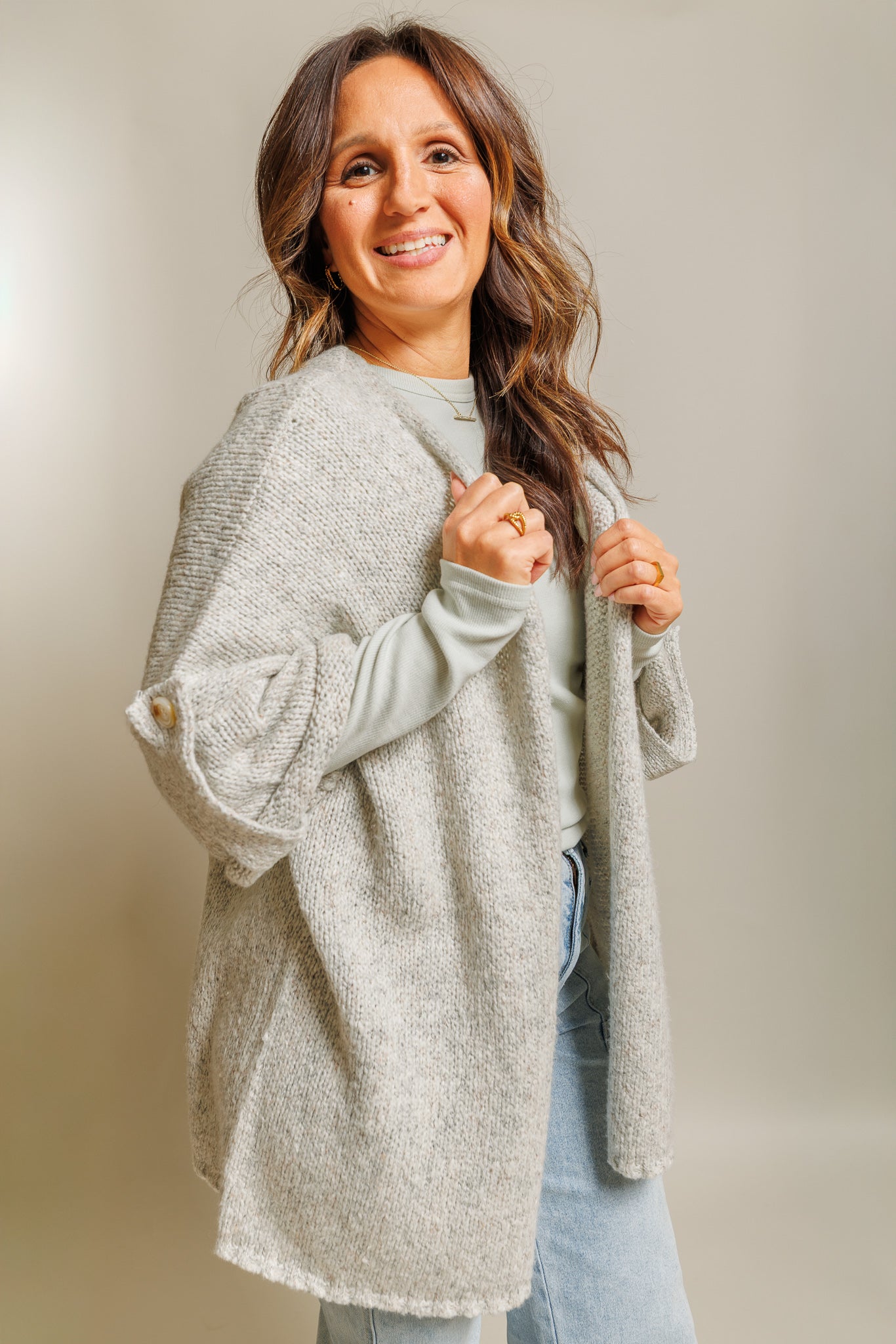 Meet the Ainsley Cardigan—your new favorite for playful layering! This light heather grey open-front piece features fun folded quarter sleeves and a cozy blend of 64% acrylic, 20% cotton, and 16% polyester. Perfect for adding a breezy, comfy vibe to any outfit with just the right touch of whimsy.