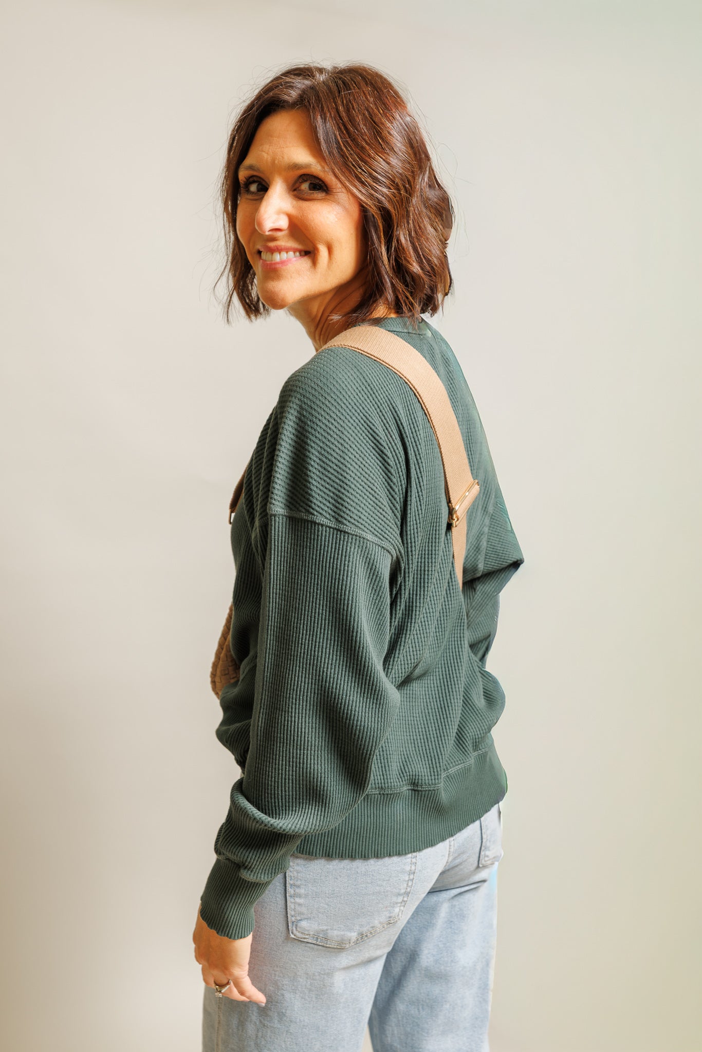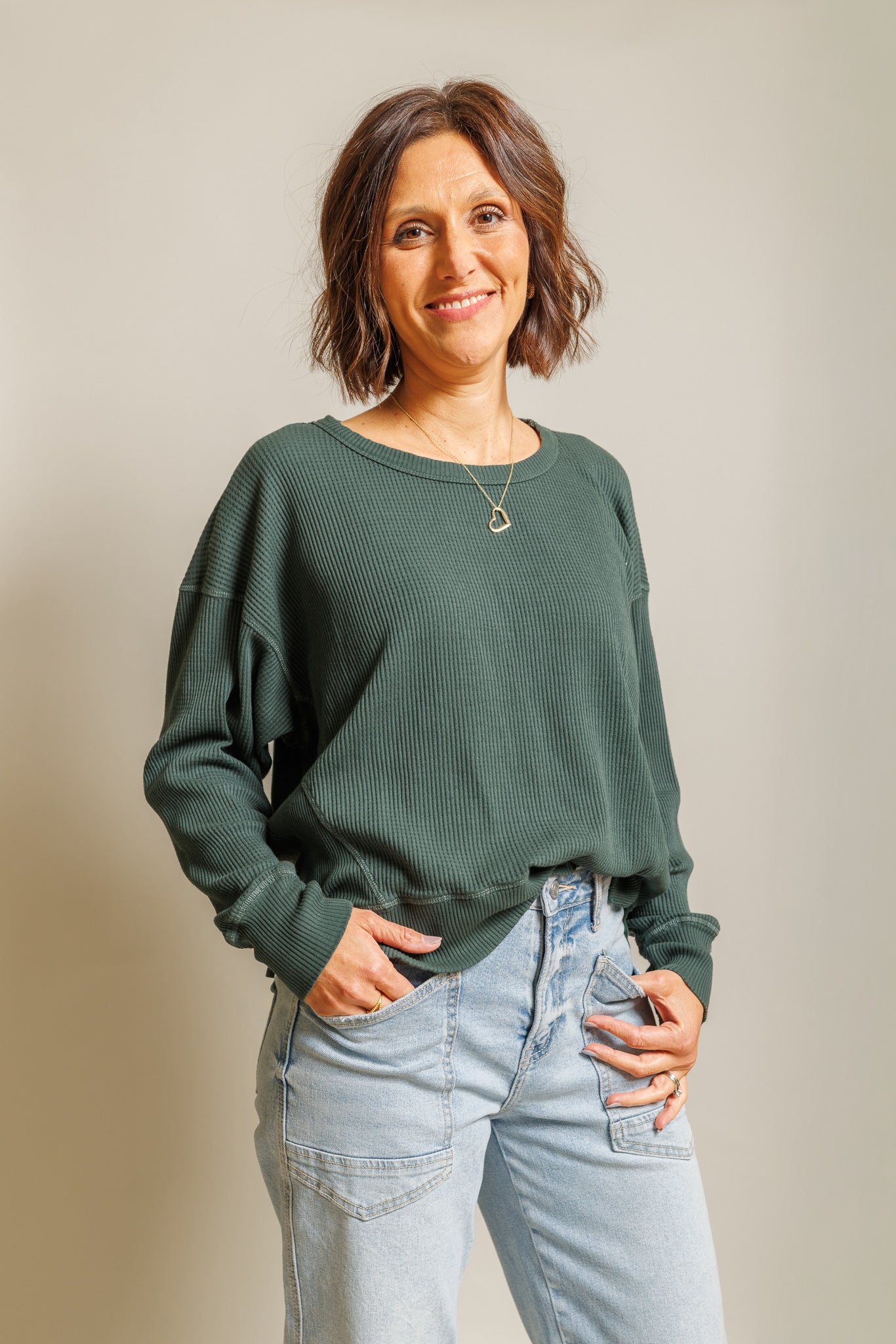 Cozy up in the Arya Top, where comfort meets style in a playful way. This hunter green knit features a relaxed drop shoulder and breezy side slits that add a flirty twist to your everyday look. Crafted from a soft blend of 92% cotton and 8% spandex. Perfect for layering or rocking solo, the Arya Top is your new go-to for casual charm.