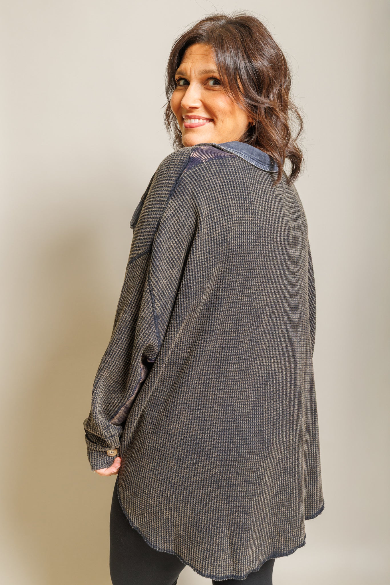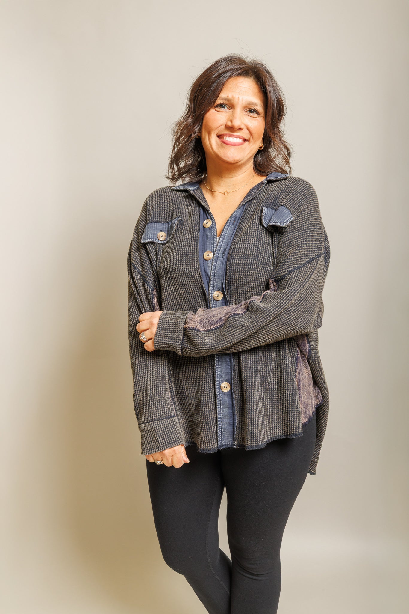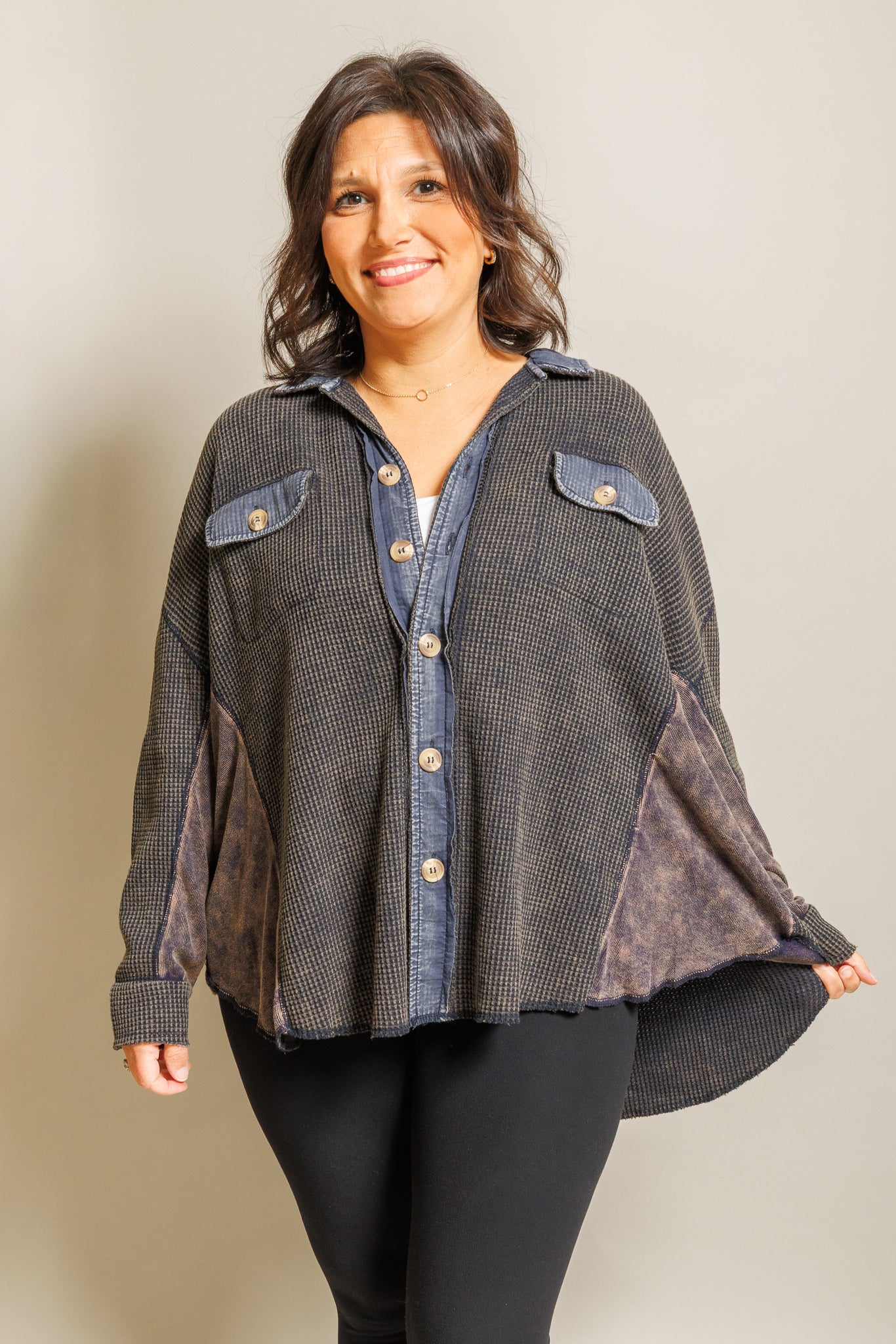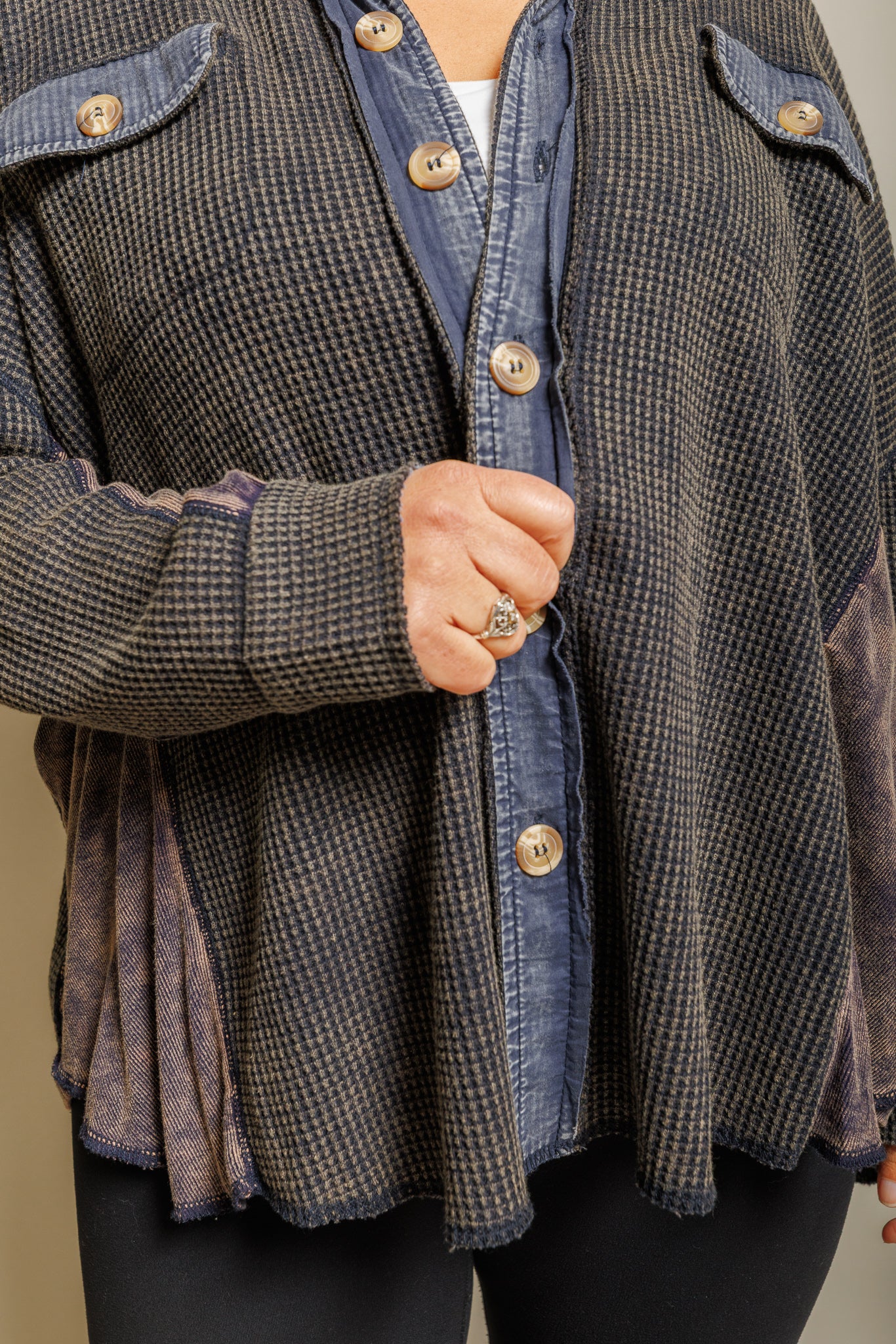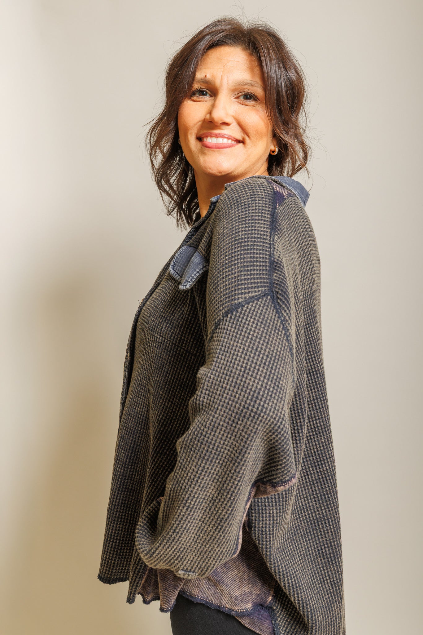 Lightweight jacket featuring a waffle knit fabric, button up front, collared neckline, chest flap pocket, dropped dolman sleeves, raw edge cut design, slouchy silhouette. Wear it alone as a shirt or layer over your favorite top as a cute jacket. To achieve the distressed look, each garment is bleach washed and can differ slightly to the images due to this process. This is mainly on the sides of the garment and is a part of attaining the true vintage look.
