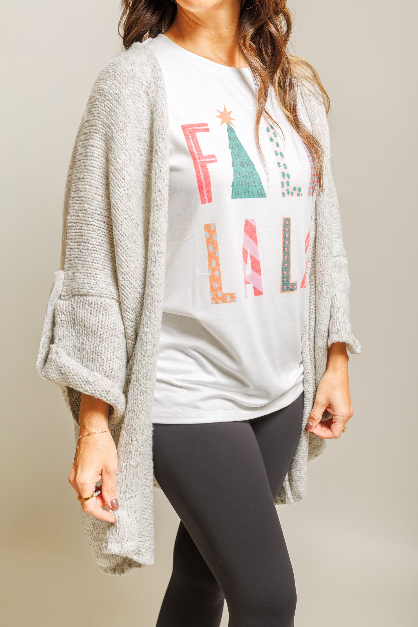 Spread holiday cheer in this festive FaLaLaLa Tee! Crafted from a comfortable cotton-poly-spandex blend, this tee features a playful rolled cuff design that adds a touch of casual flair. The stretchy fabric moves with you, making it perfect for holiday gatherings, festive parties, or cozy seasonal celebrations. Whether you're decking the halls or just getting into the spirit, this cheerful tee brings the joy and comfort you need all season long.