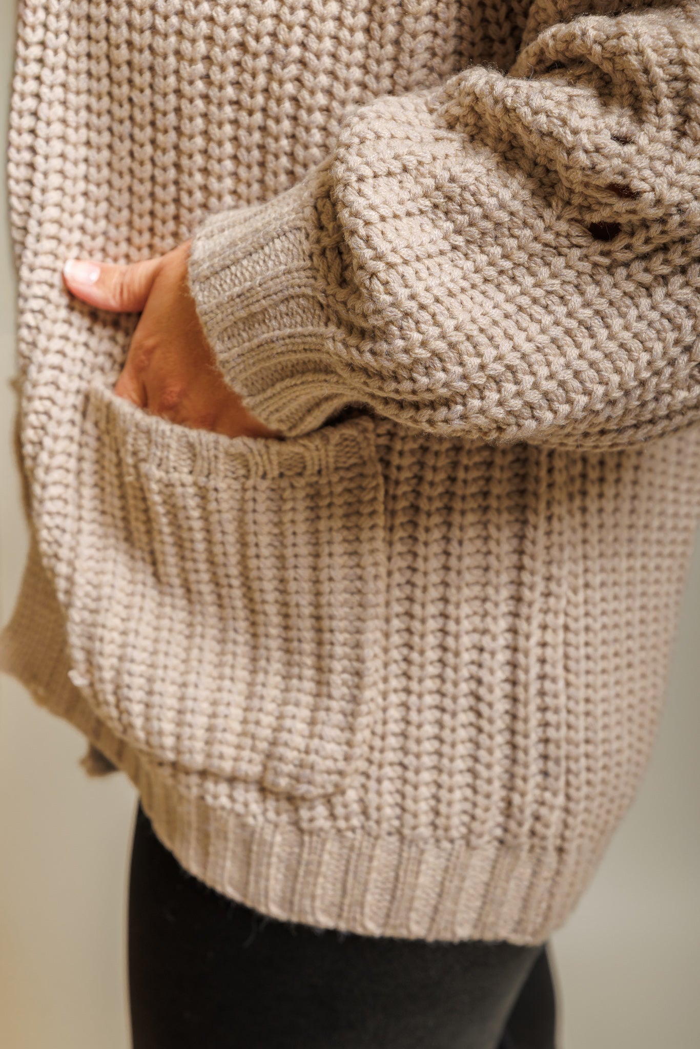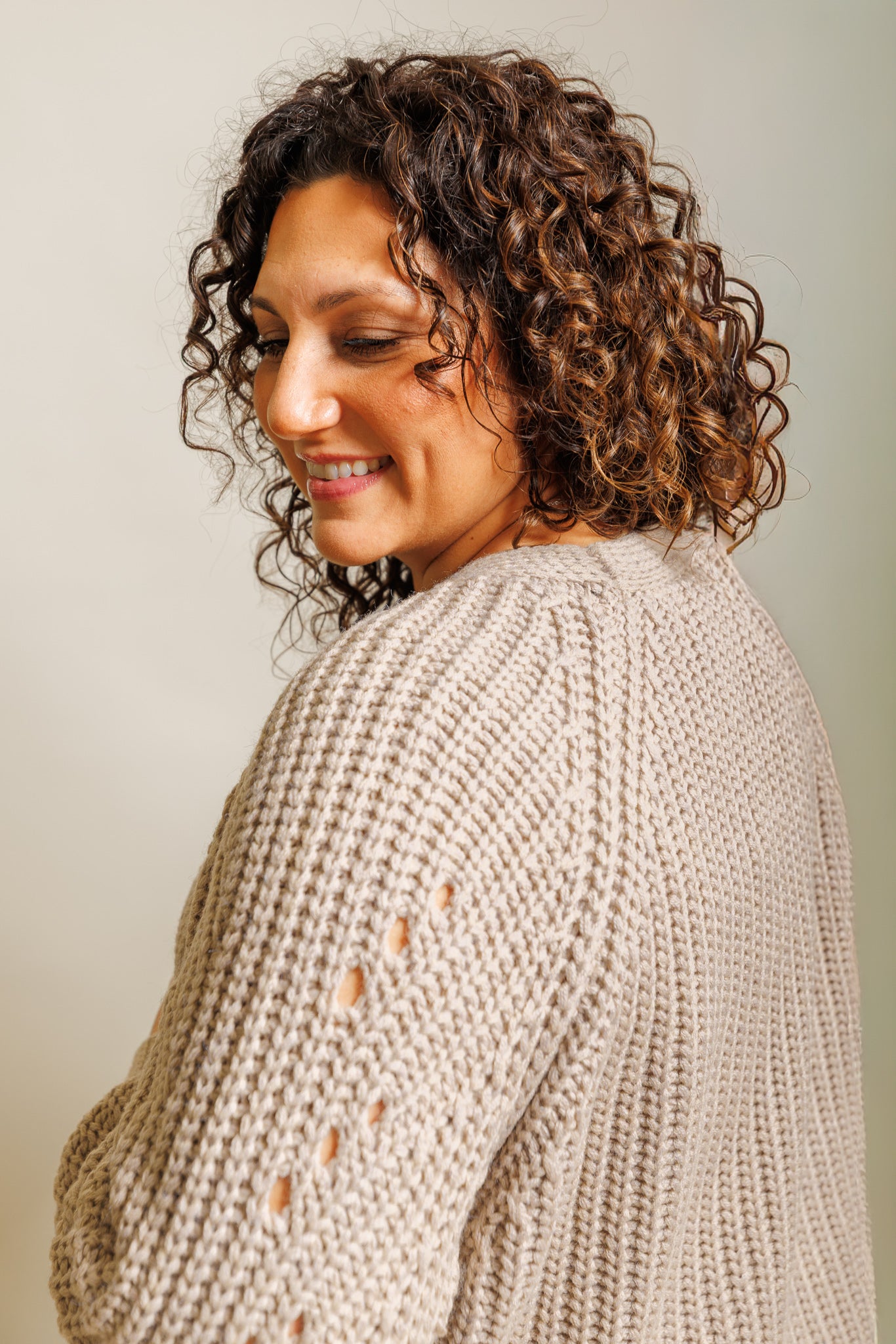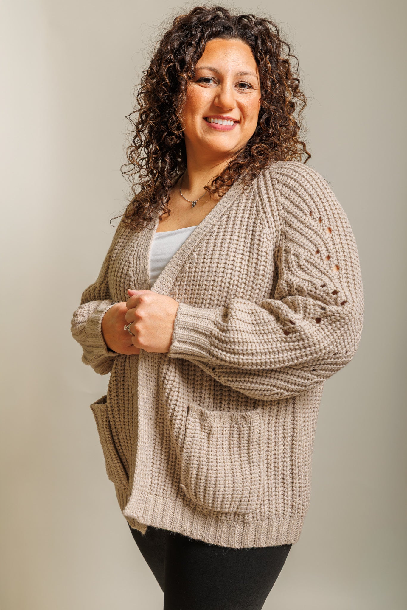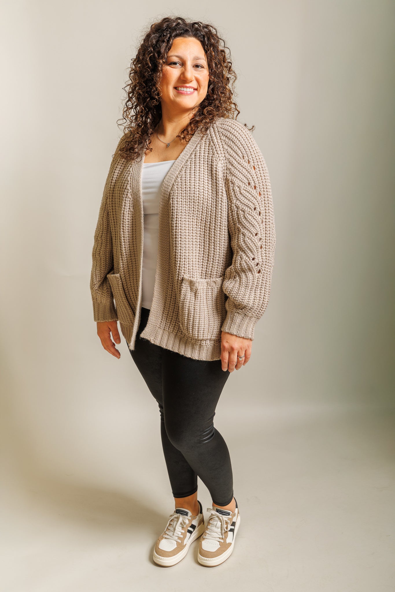 The Quincey Cardigan is the definition of cozy refinement. Crafted in a chunky pointelle knit from a soft acrylic and nylon blend, it features an oversized, slouchy fit with dropped shoulders for effortless ease. Designed to layer beautifully, this cardigan brings texture, warmth, and quiet confidence to everyday dressing.
