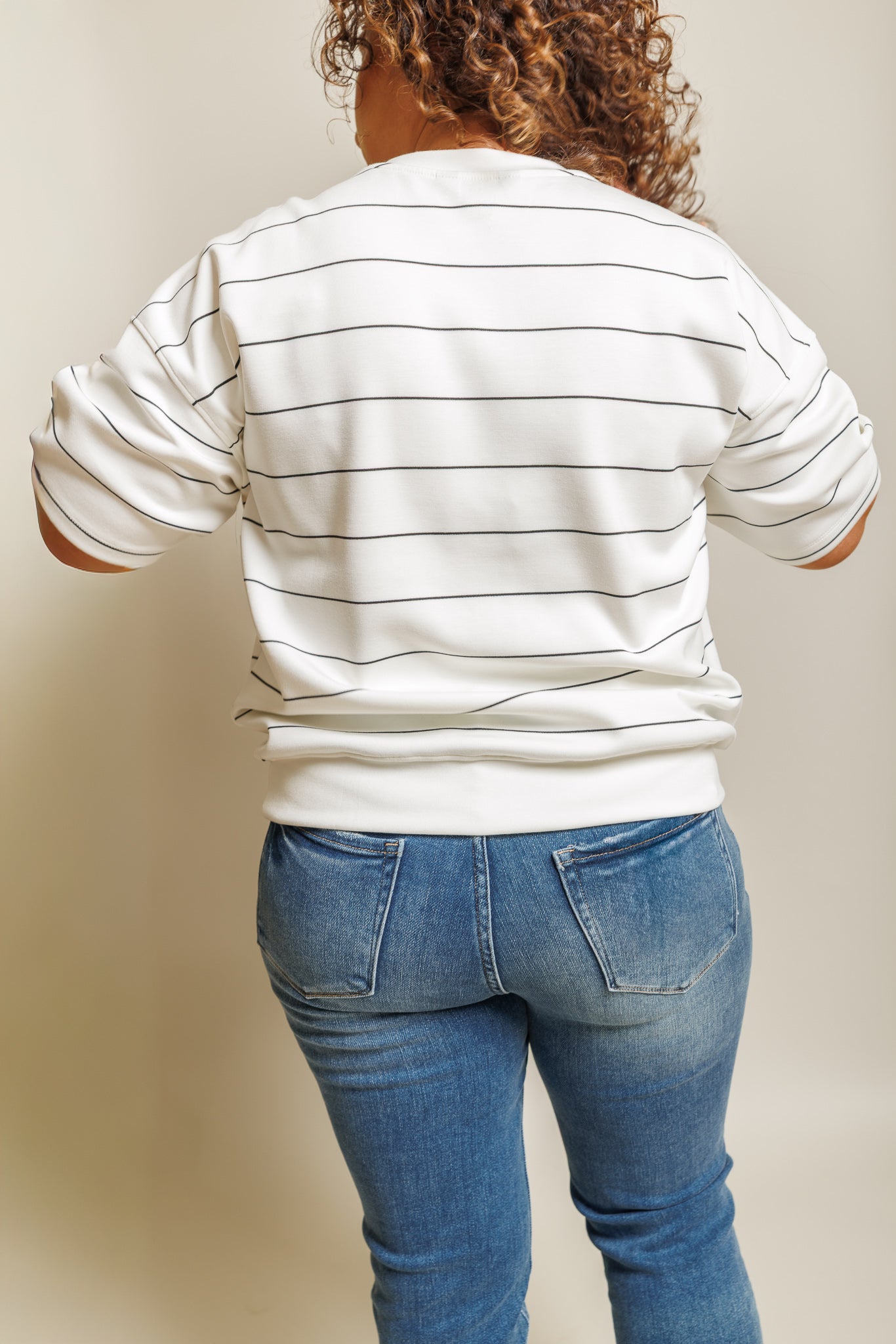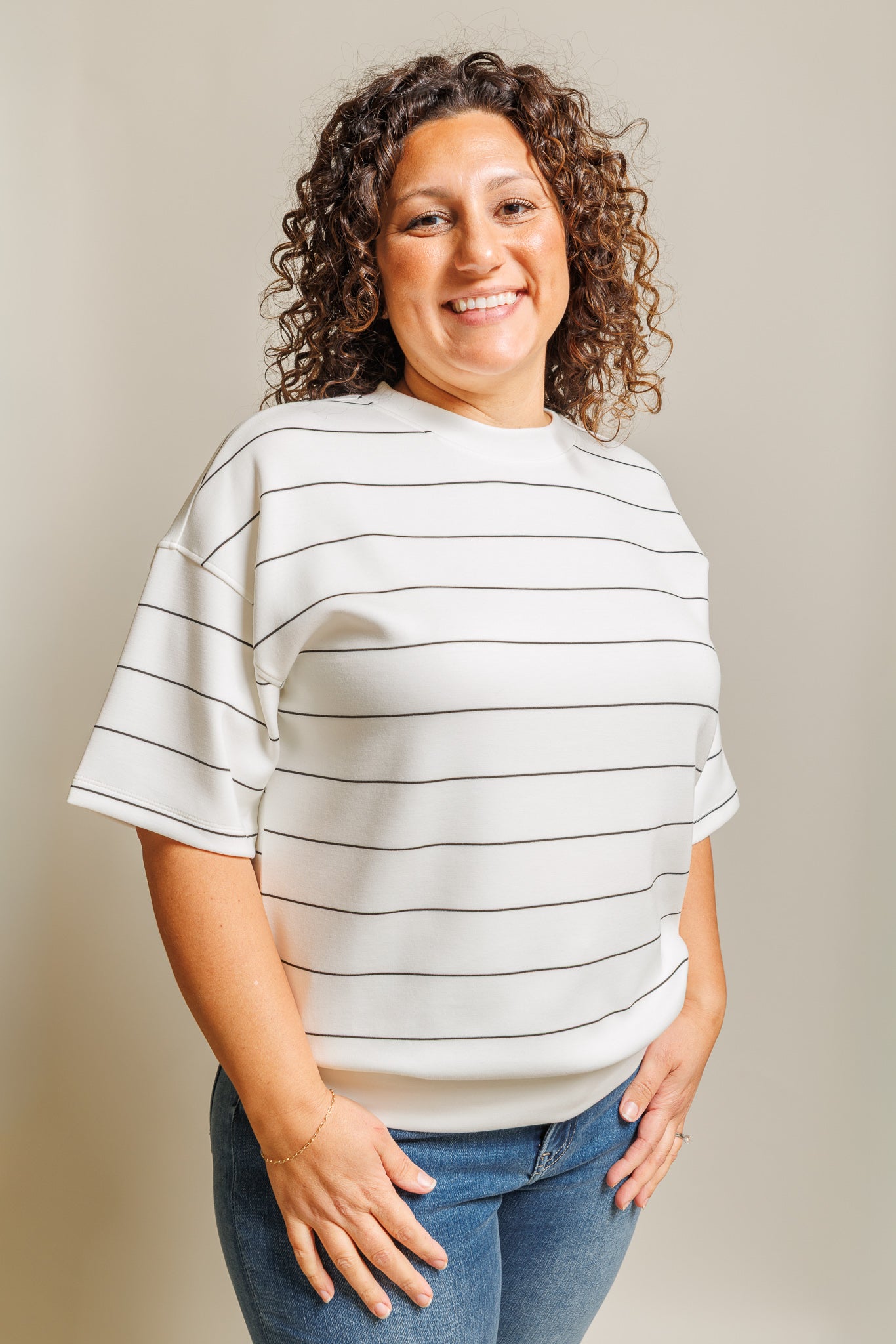 The Rosalie Top is a versatile and stylish addition to any wardrobe. Made with a blend of modal, rayon, polyester, and spandex, this cream with thin black stripes top offers a comfortable and flattering fit. The modal fabric provides a soft feel, while the rayon and polyester add durability and the spandex offers stretch for easy movement. Perfect for any occasion, this top is a must-have for any fashion-forward individual.