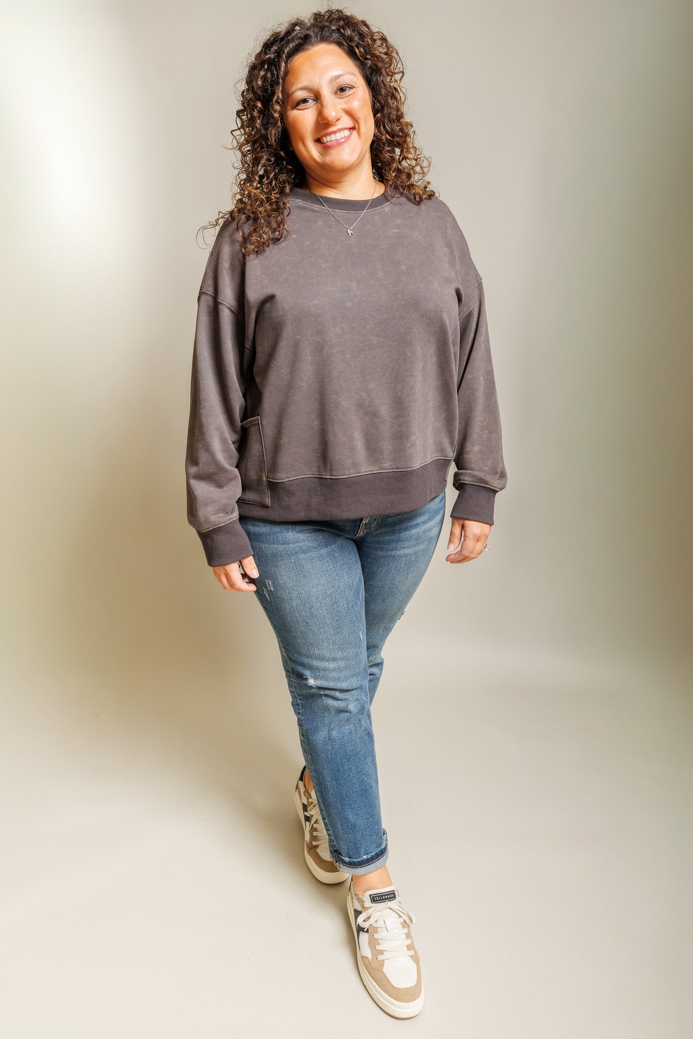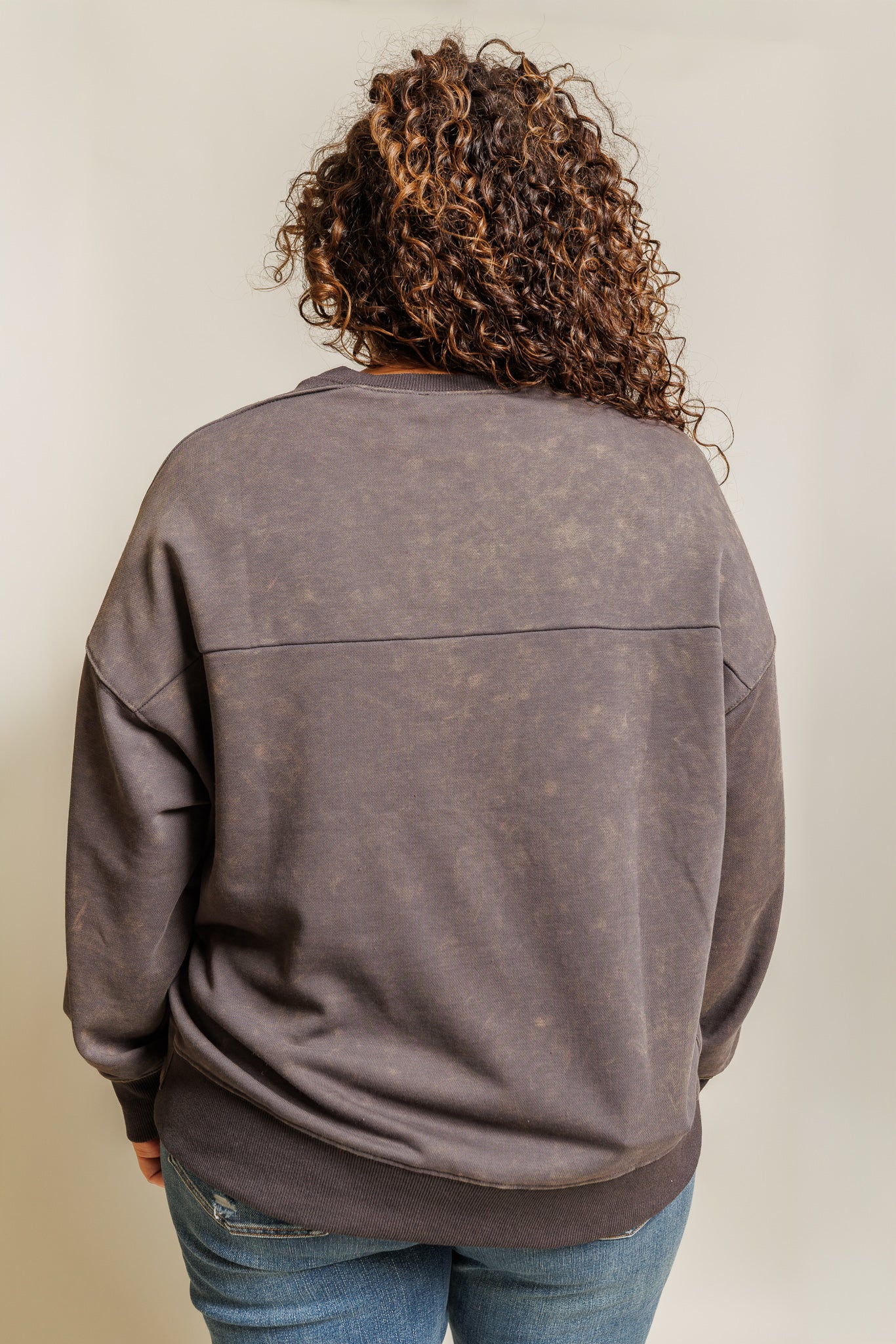 Embrace a cool, lived-in aesthetic with this vintage-inspired sweatshirt. It's crafted from a soft, mineral-washed fleece in a faded charcoal hue, giving it a unique, perfectly worn-in look. The design features an oversized, relaxed fit with dropped shoulders, a distinctive notched crew neckline, and two large front patch pockets for a touch of utility. Contrasting ribbed trim on the hem, cuffs, and shoulder panels adds a subtle, stylish finish to this ultimate comfort-meets-style piece.