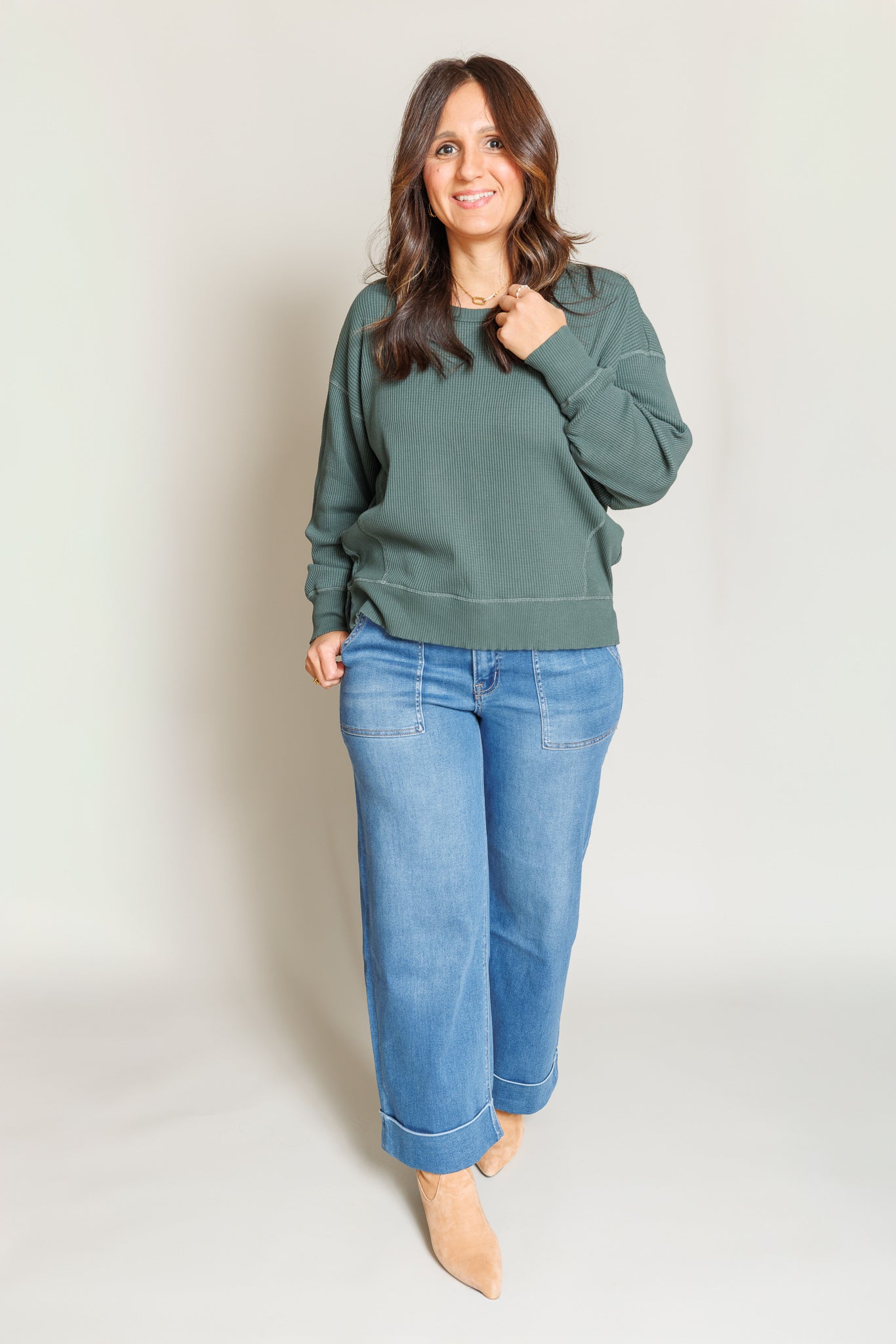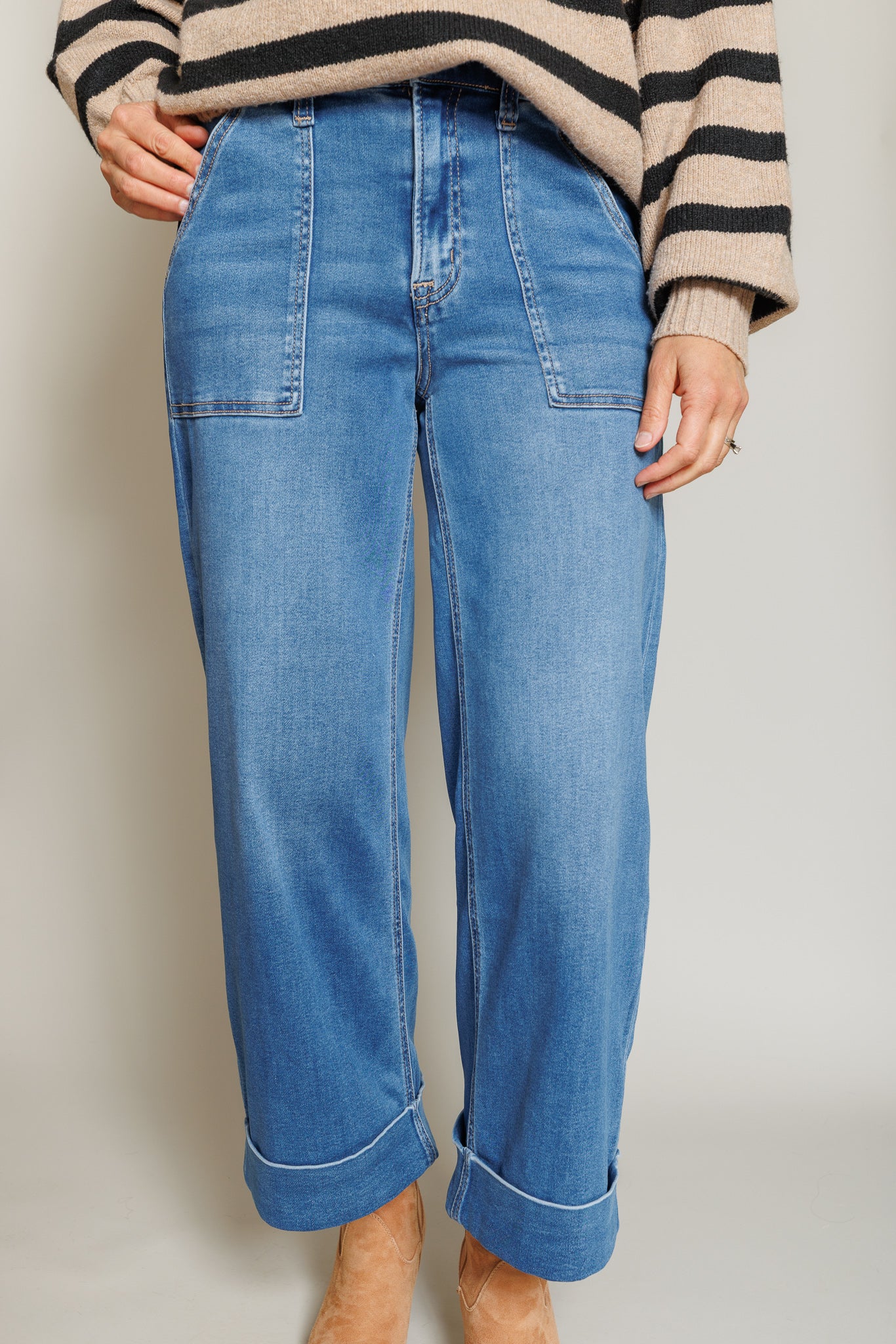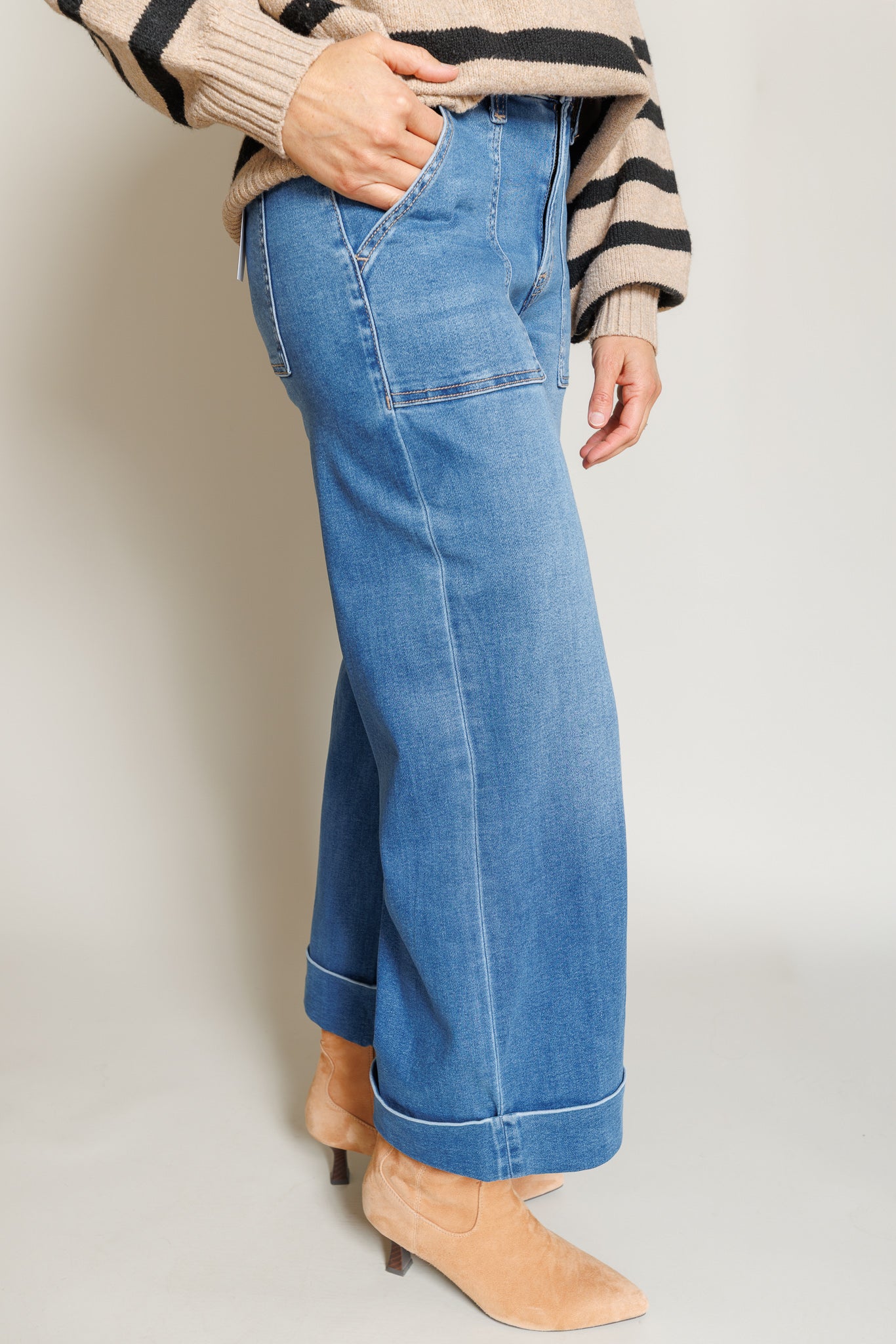 Meet the Belle Denim—your new favorite pair of jeans that actually feel as good as they look. These baggy beauties feature a flattering high rise cut with a playful double cuff hem that adds serious style points. Crafted from a dreamy blend of cotton, modal, and a touch of stretch, they're soft enough to live in all day long. The cropped length hits just right, while the generous wide leg gives you that effortless vibe.
