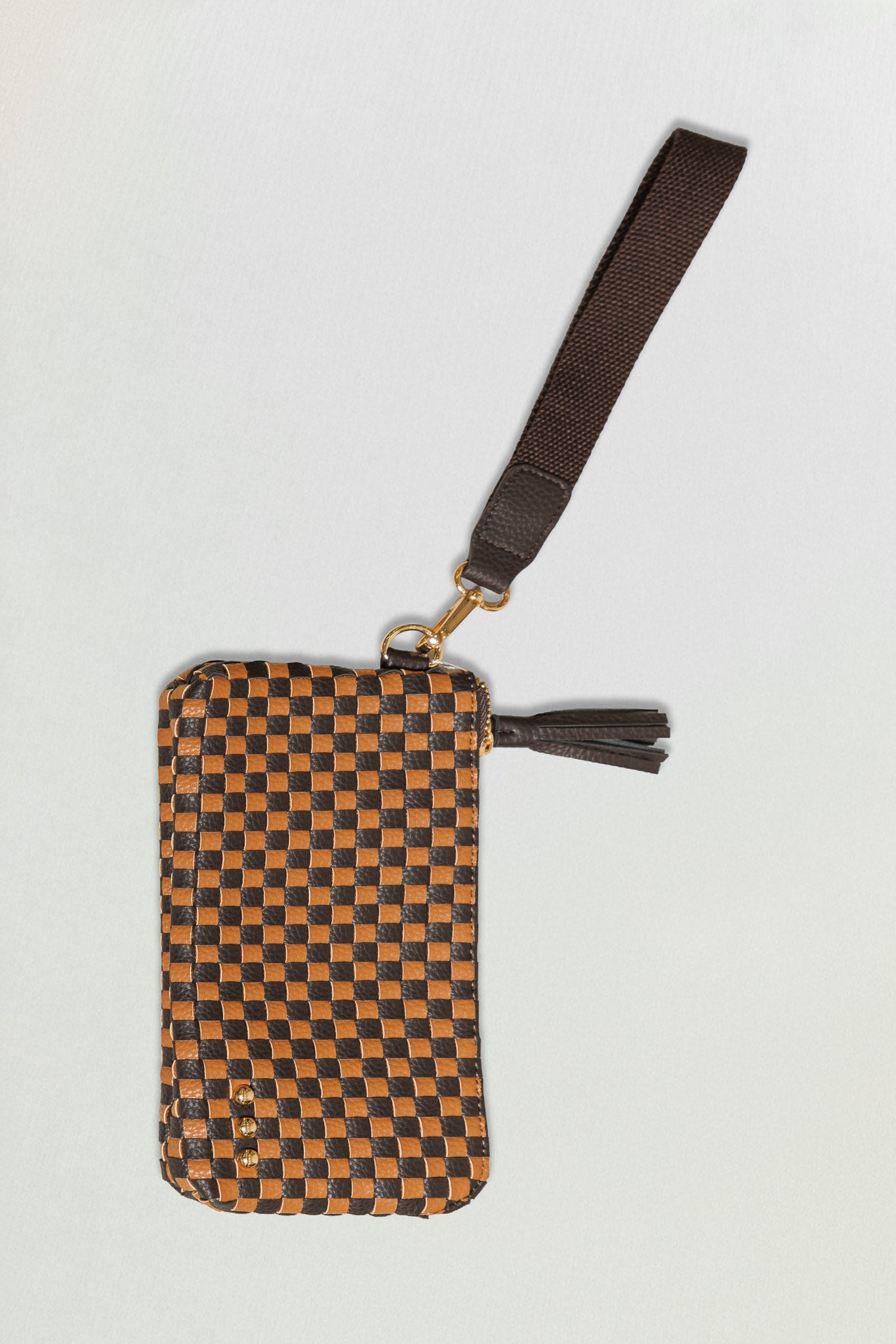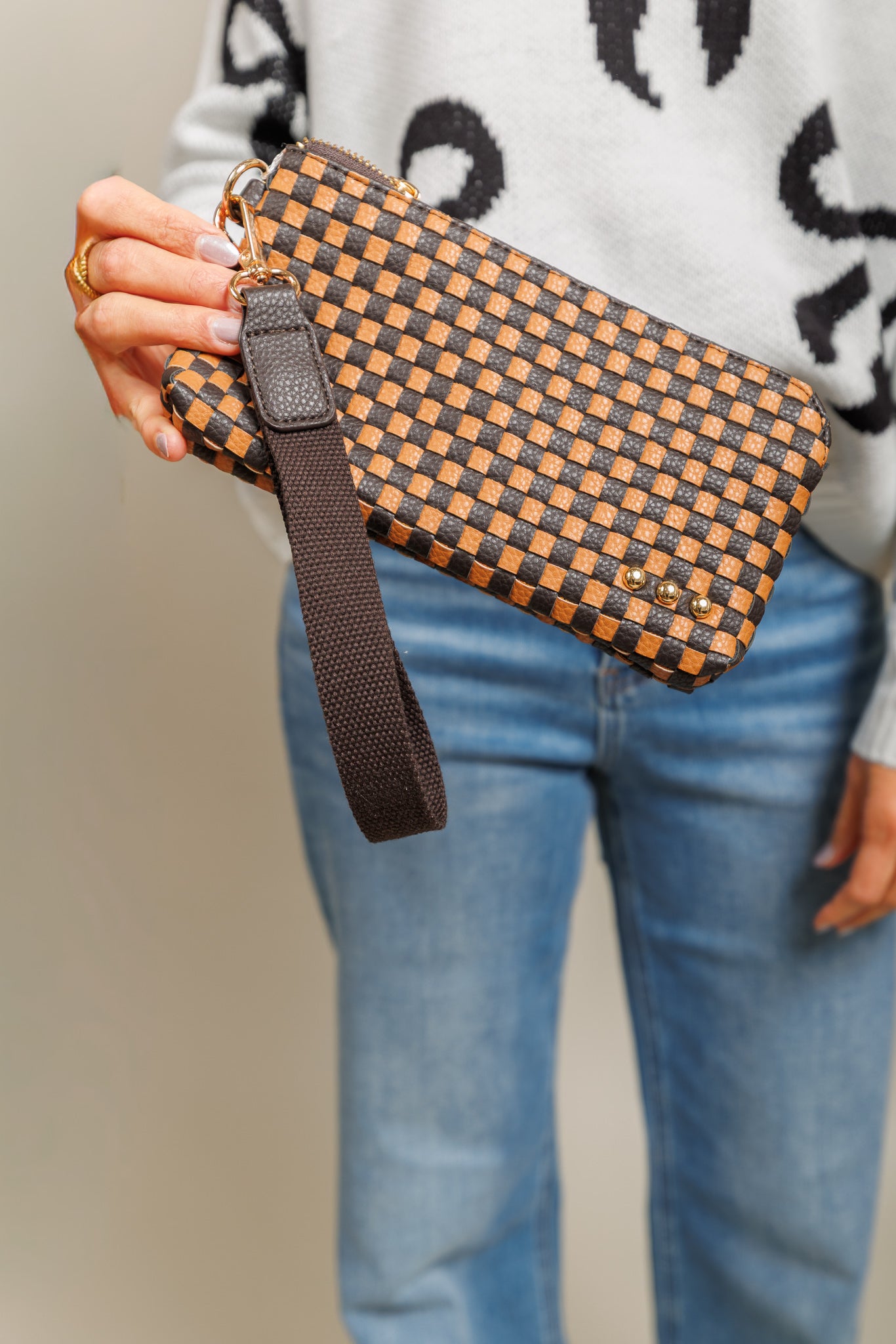 Make a statement with the Emma Woven Clutch Wristlet. Crafted from premium vegan leather, this versatile bag has a wristlet strap inside and an interior card holder for convenience. It's the perfect accessory for any occasion!