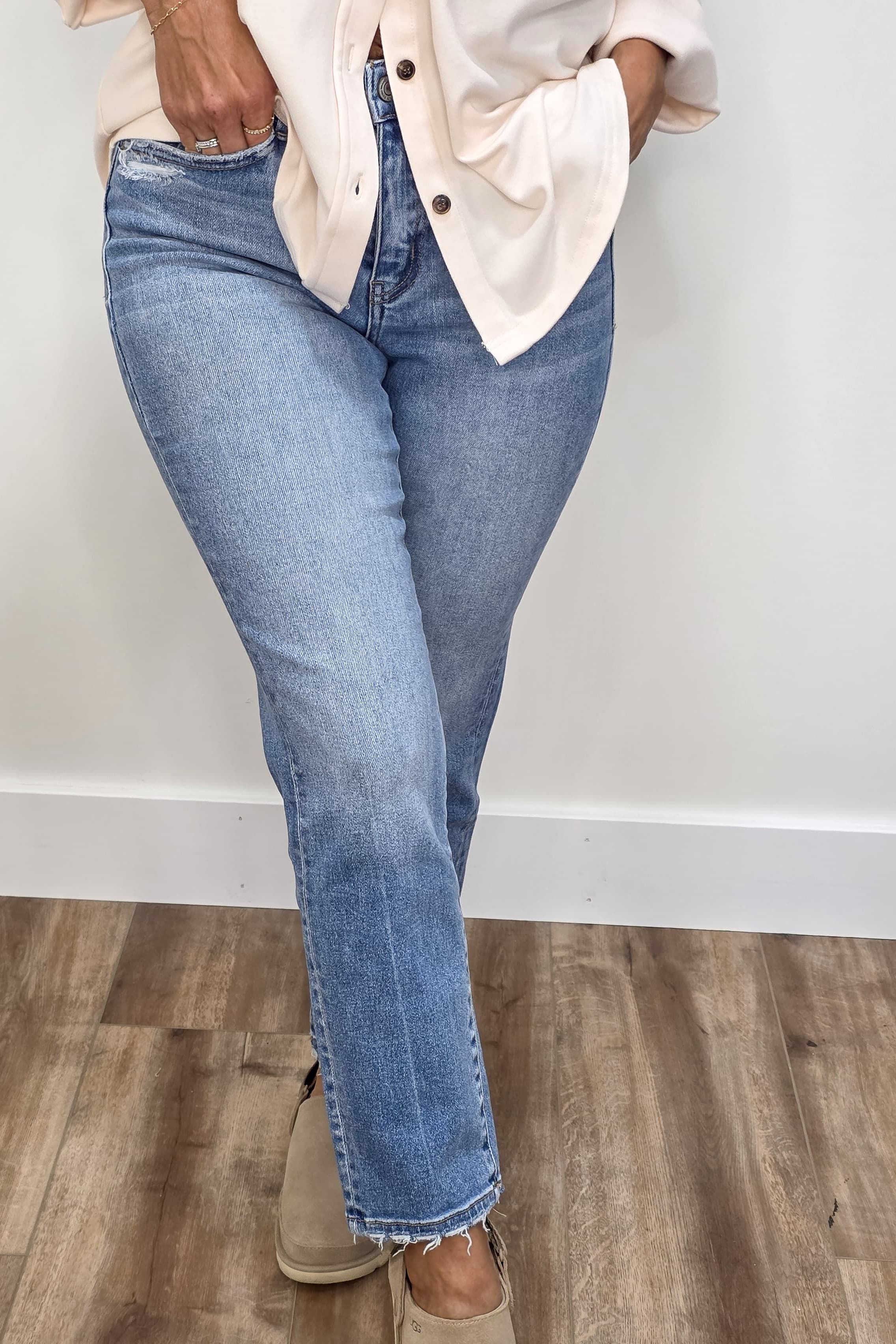 Lauren Denim by Vervet offers a playful twist on classic style with its high-rise tapered straight leg silhouette. Crafted from a comfy blend of 93% cotton, 5% polyester, and 2% spandex, these jeans provide just the right stretch. Light distressing around the pockets and hem adds a fun, lived-in vibe perfect for everyday adventures.