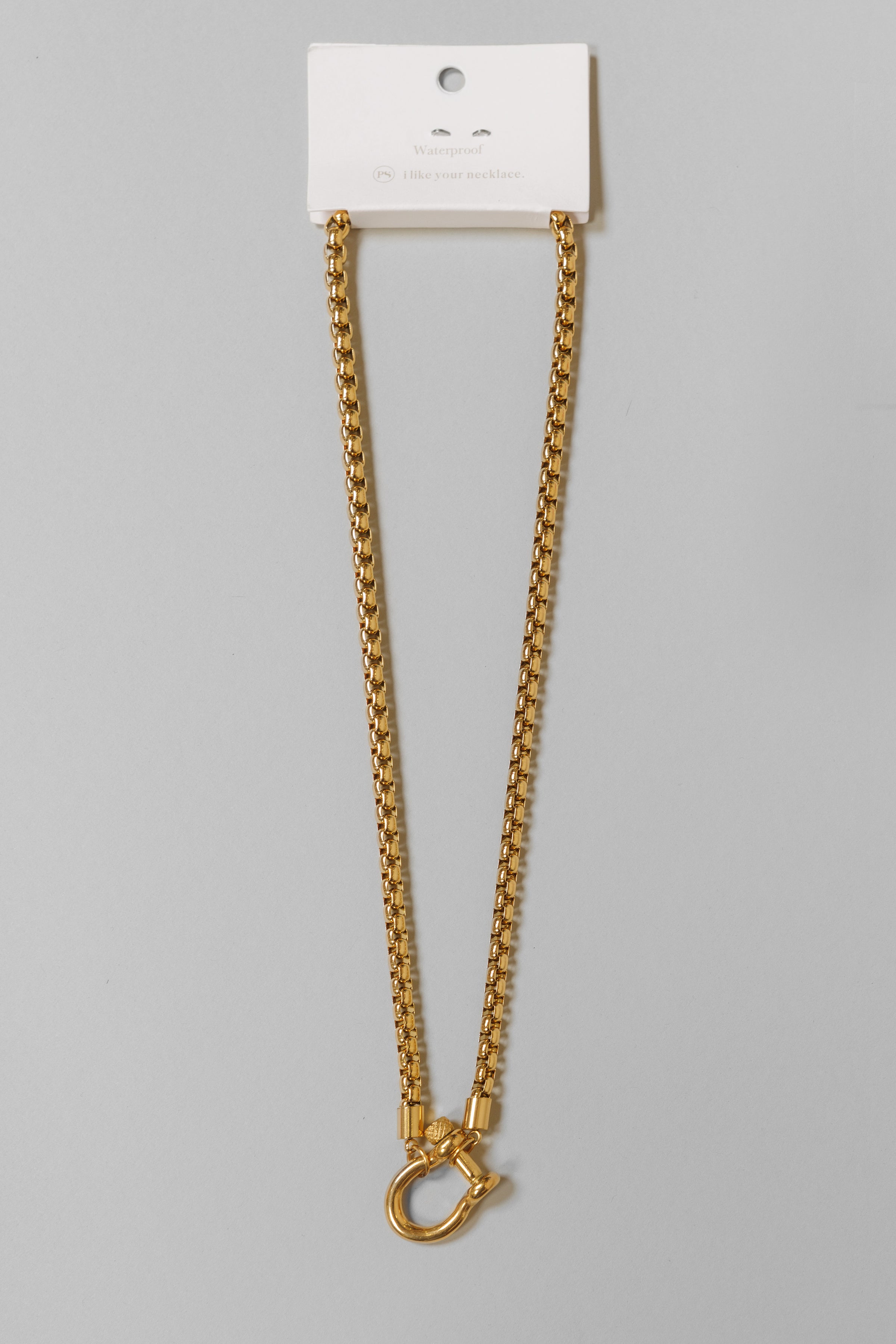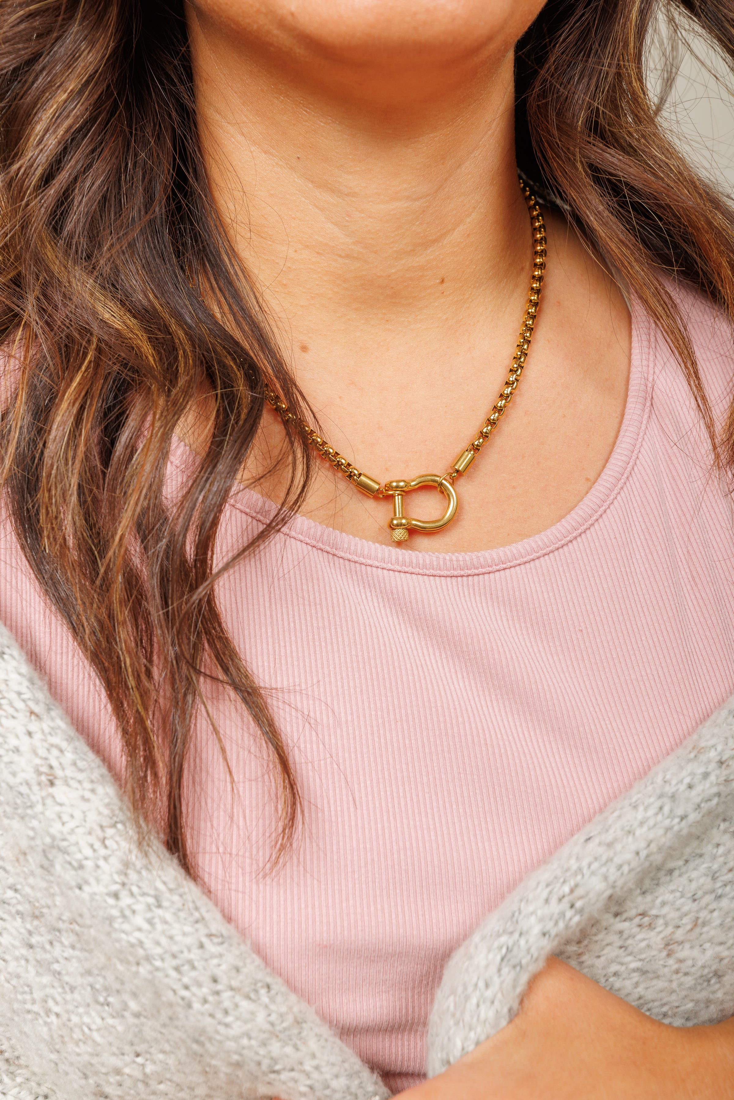 The Lucky Me Horseshoe Toggle Necklace is a bold, statement-making piece with timeless appeal. Designed with a chunky gold chain and finished with a horseshoe toggle as the focal charm, this necklace balances strength and style with ease. Wear it alone or layered for a look that feels confident, polished, and intentional.