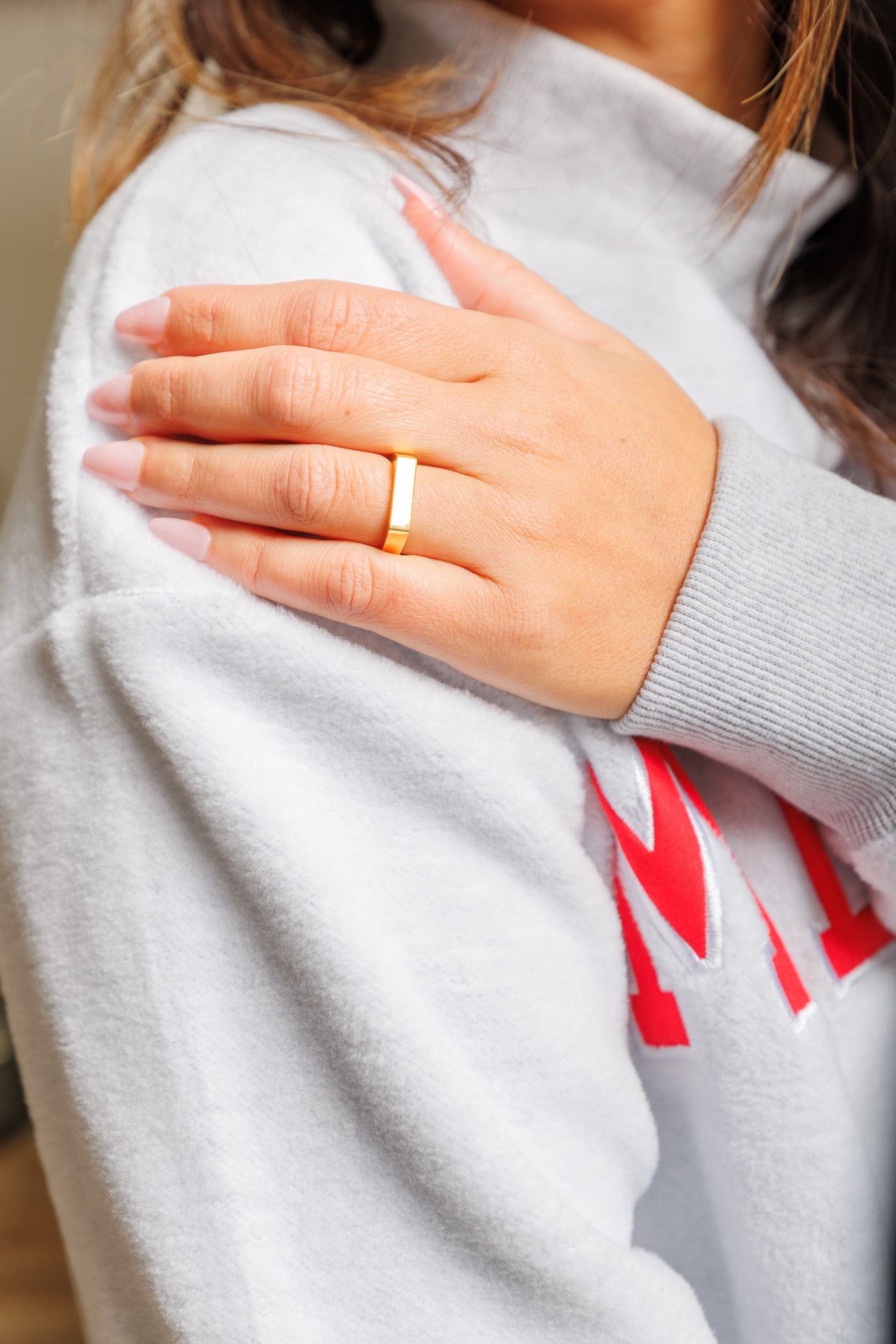 The Luxe Gold Bar Ring is a modern staple designed to elevate the everyday. Crafted from stainless steel with an 18k gold finish, this sleek bar ring is waterproof, durable, and made to last. Lead and nickel free, it’s a refined piece you can wear confidently — simple, timeless, and effortlessly polished.