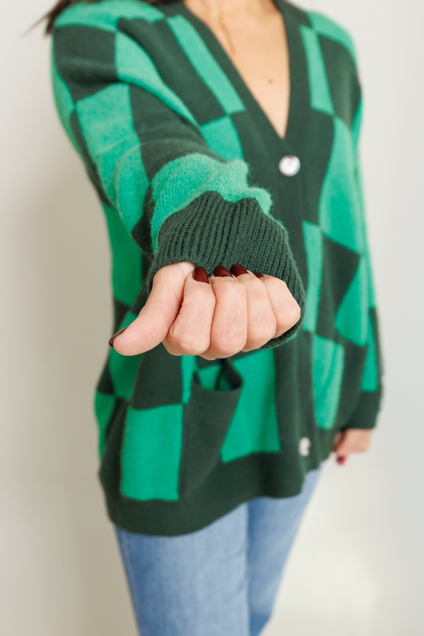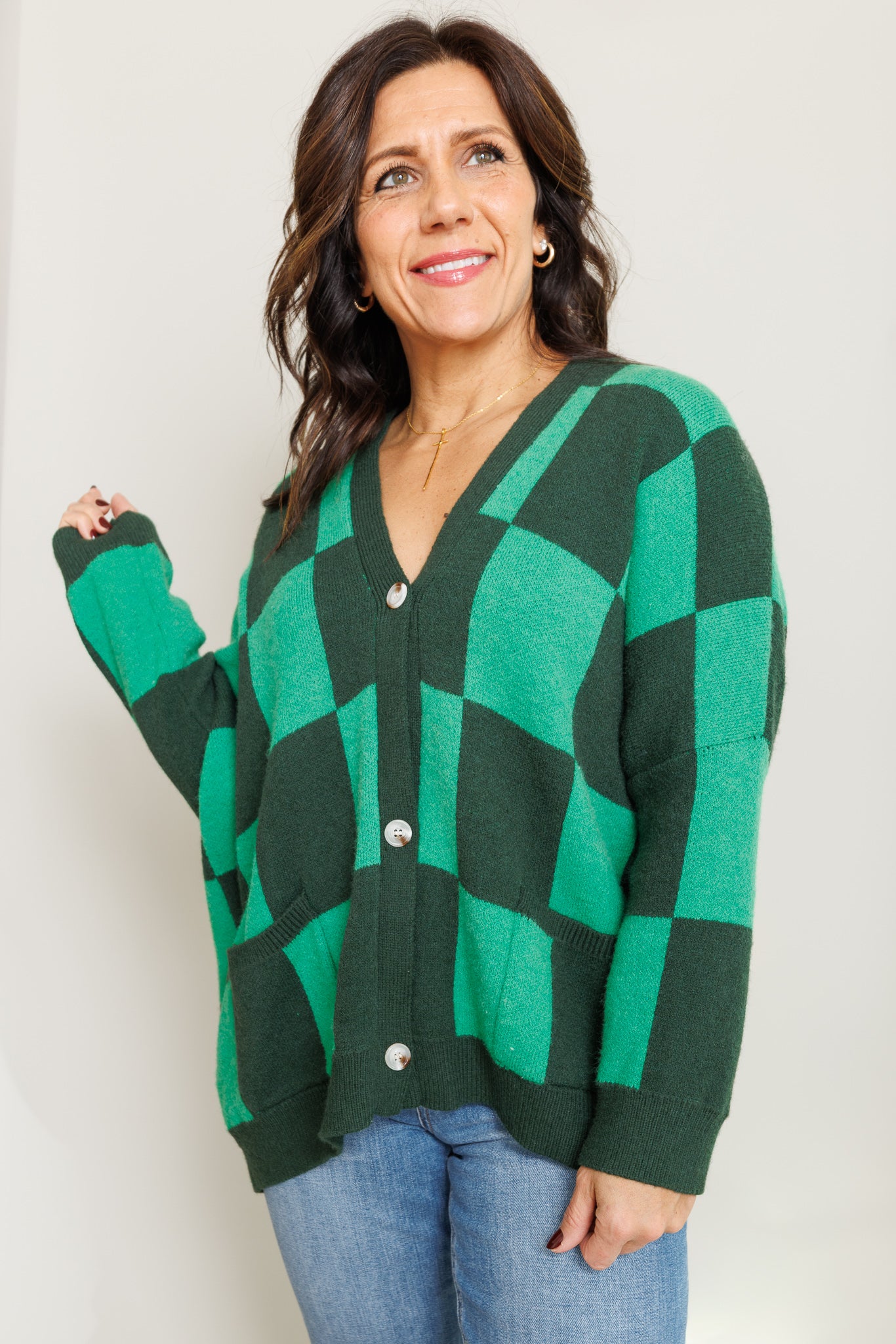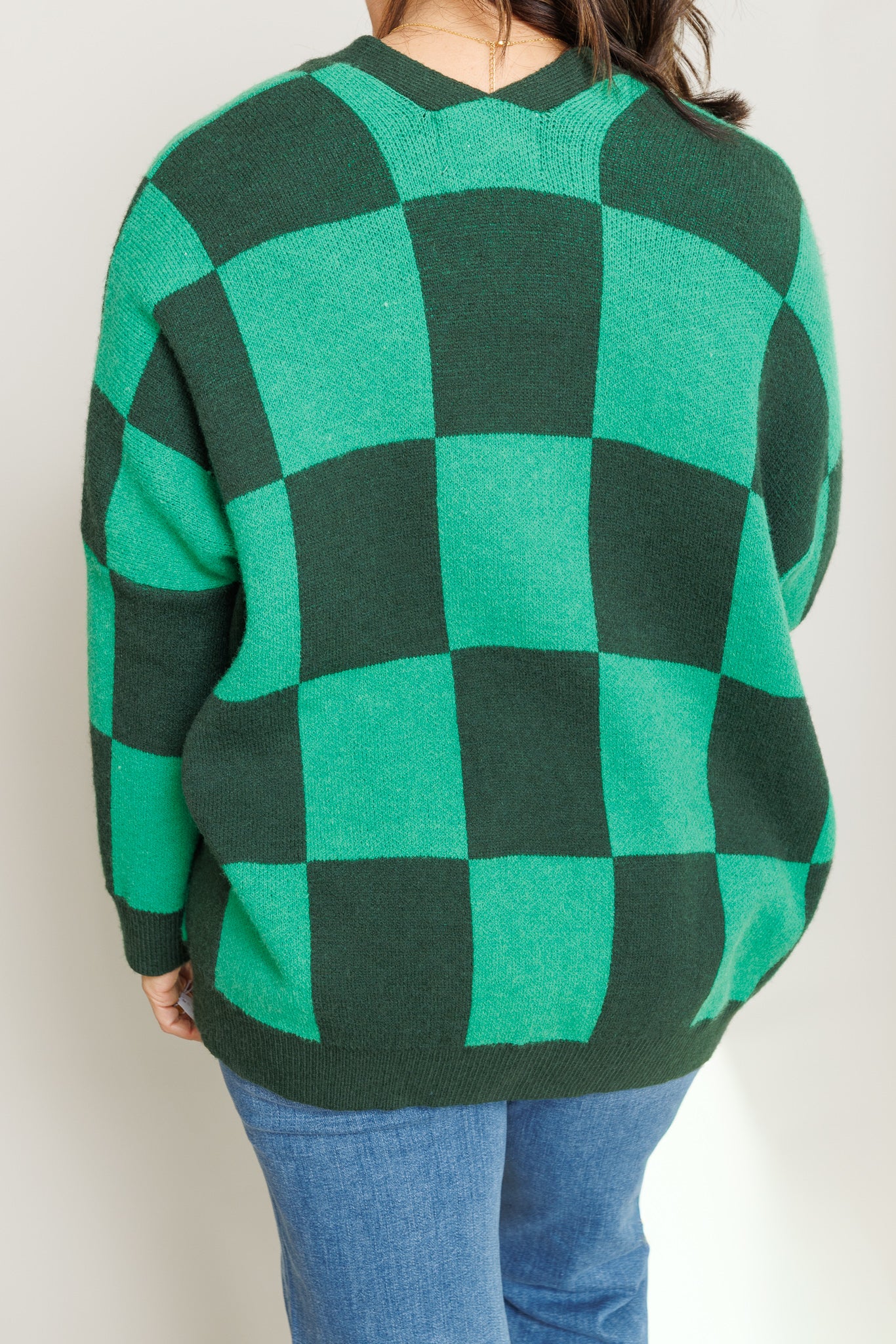 • Green checkered cardigan