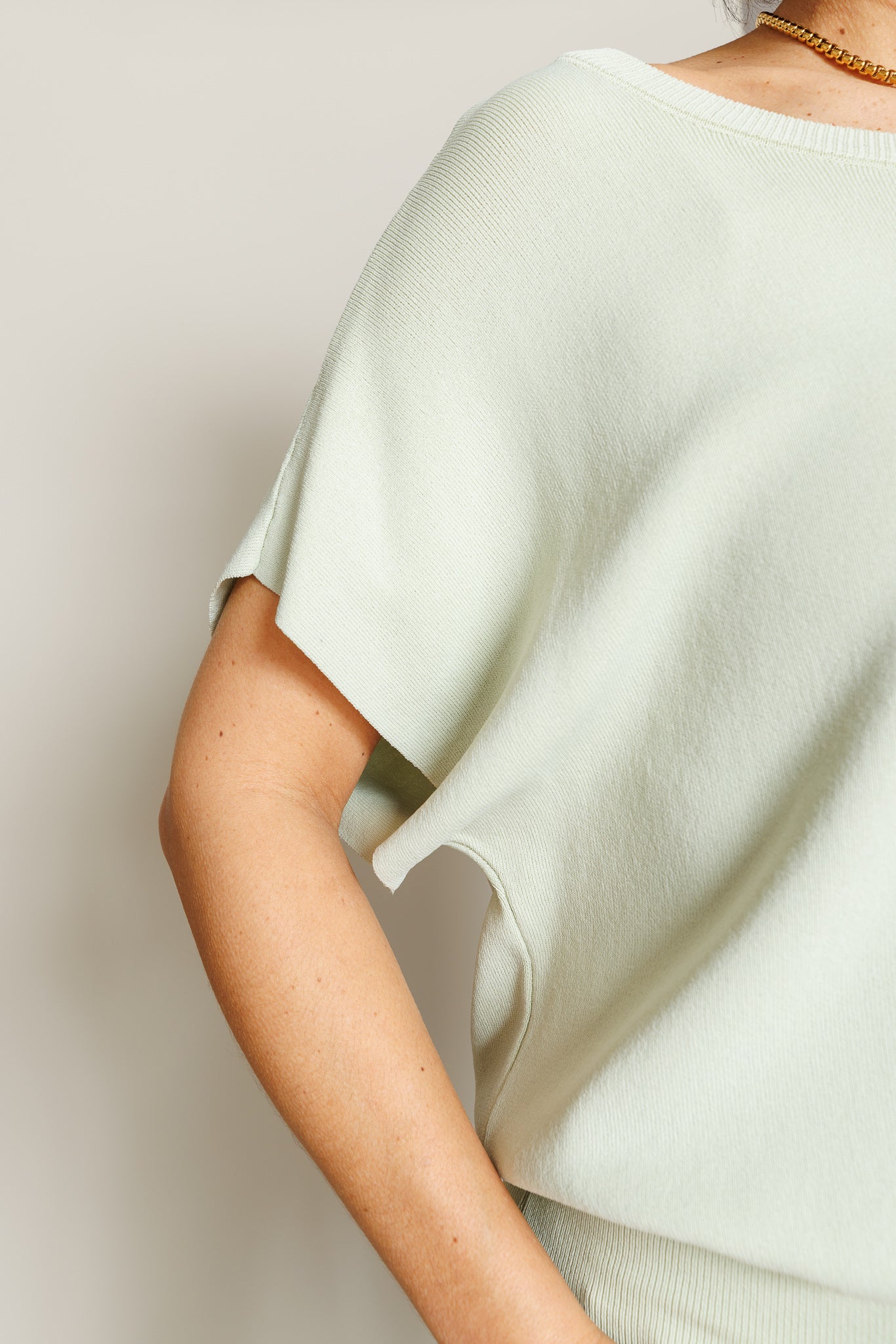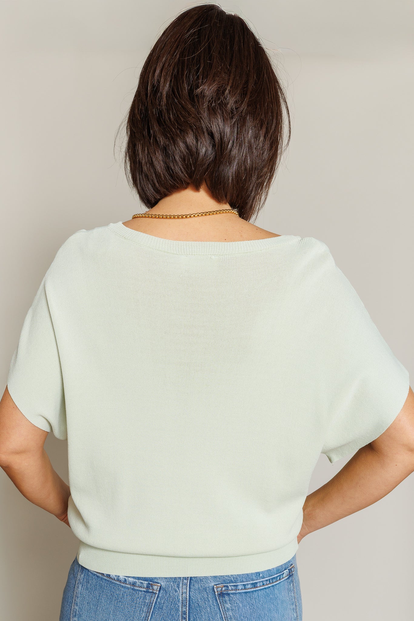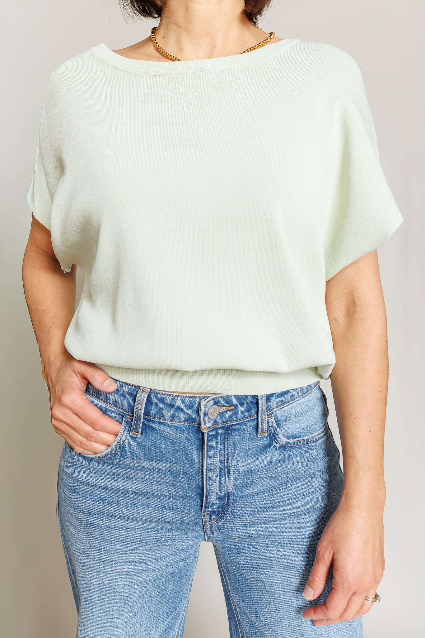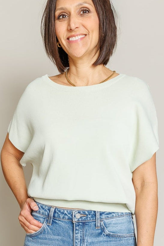 The Lenox Top brings a fresh, effortless feel to everyday styling. This short sleeve blouse features a soft, flowy silhouette balanced by a cropped band at the hem for subtle structure. Finished in a light mint green hue, it’s an easy, polished piece that pairs beautifully with high-rise denim or tailored bottoms.